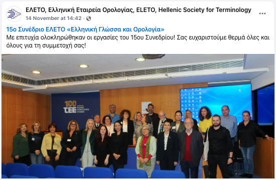 The TALOS Lab is pleased to announce Dr. Maria Papadopoulou’s participation in the 15th Conference “Hellenic Language & Terminology” (6–8 November 2025, Athens). Organized by the Helenic Society for Terminology (ELETO) in collaboration with the Department of French Language & Literature (NKUA) and the Technical Chamber of Greece (TCG)—under the auspices of NKUA’s Faculty of Philosophy and dedicated to the memory of Prof. Panagiotis Kontos—the conference maps the current state of the Greek language in its terminological dimension and highlights principles, methods, practices, and tools of Terminology Science (mono- and cross-lingual) for the enrichment of Greek terminology. The program features 26 presentations by Greek and international scholars.