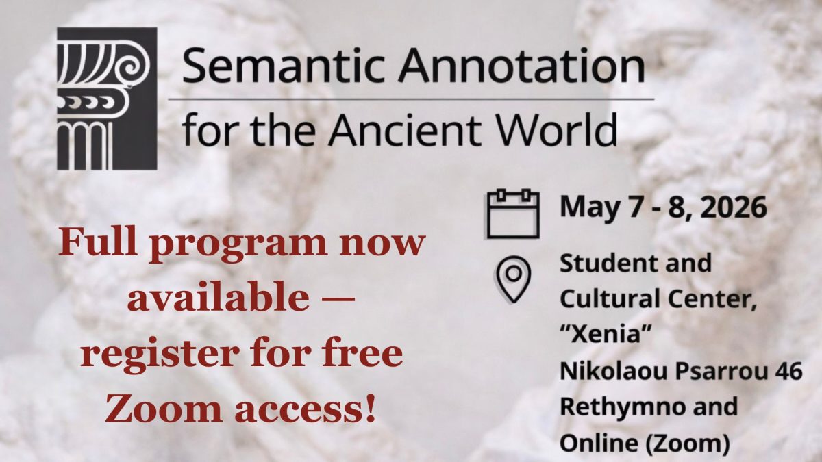 The TALOS Centre is excited to announce that the full program for the 2nd Semantic Annotation for the Ancient World (SA4AW) Conference is now available! Join us on May 7–8, 2026, online via Zoom or onsite at the Student and Cultural Center “Xenia” (Rethymno, Crete), for a hybrid event exploring the critical intersection of semantic annotation, hybrid AI approaches, Large Language Models (LLMs), and knowledge graphs in the study of antiquity and cultural heritage.