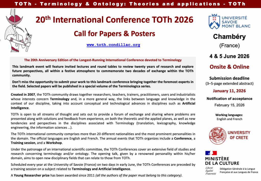 The 20th Anniversary Edition of the longest-running international conference on terminology, TOTh 2026, will be held on June 4–5, 2026, at Université Savoie Mont-Blanc. The conference celebrates two decades of research and collaboration in terminology and ontology, inviting submissions on language, knowledge representation, and AI applications by January 11, 2026.