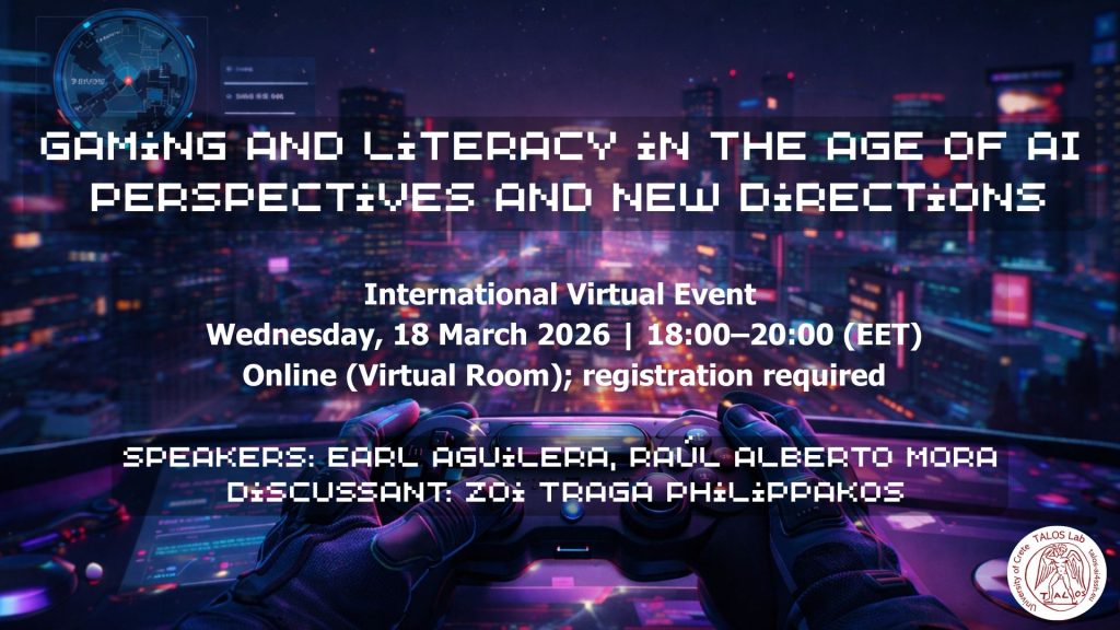 The TALOS–AI4SSH Lab at the University of Crete announces the virtual event “Gaming and Literacy in the Age of AI: Perspectives and New Directions” (18 March 2026, 18:00–20:00 EET). Open to the public (registration required), the event explores how gaming environments shape meaning-making, identity, and multimodal literacies, and how these processes are being reshaped by artificial intelligence and the growing need for critical AI literacy. Speakers include Dr. Earl Aguilera and Dr. Raúl Alberto Mora, with Dr. Zoi Traga Philippakos serving as discussant.