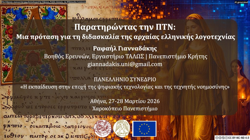 TALOS Research Assistant Rafail Giannadakis presented a pedagogical framework for teaching Ancient Greek literature using Generative AI multimedia at the 3rd Panhellenic Conference on AI in Education. His approach enables students to understand the operational logic of GenAI while gaining a deep understanding of primary sources, as they must rely on the original text to identify “hallucinations” and biases in AI-generated visual and auditory outputs.