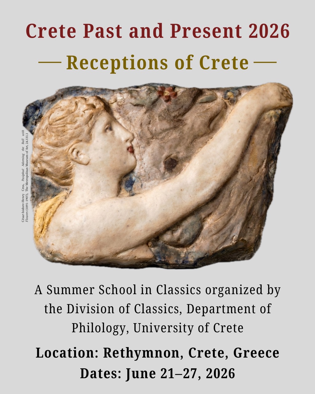 Taking place in Rethymnon (Crete, Greece), the Summer School invites participants to explore how Cretan archaeological sites and landscapes, myths and legends, and literary traditions have been represented and reinterpreted from antiquity to the present across film, drama, poetry, and music. The programme combines seminars with organised visits to major archaeological and museum sites, including Eleutherna, Knossos, the Archaeological Museum of Rethymnon, and the Archaeological Museum of Heraklion.