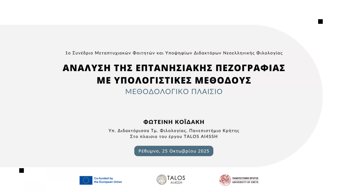 The TALOS Lab is proud to announce the participation of Fotini Koidaki, PhD Candidate of Research Topic 3 (RT3), at the 1st Conference of MA and PhD Students in Modern Greek Philology, organized by the University of Crete’s Department of Philology, held from October 24 to 26, 2025.
